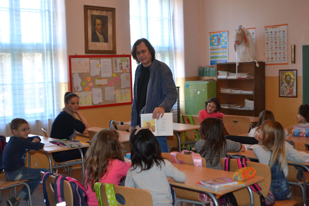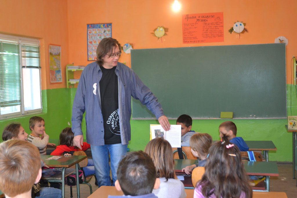 Јухууу! Стигао је мој кум Бранко. Још се није ни распаковао, а одмах је пожелео да се дружи са књажевачким малишанима. Тако смо кренули на пут. Најпре смо обишли децу у школи у Подвису, а затим и у Васиљу. Какво је то дружење било! Бранко им је говорио песме и приче из својих и књига Игора Коларова... „Ето тако“, па „Џепне приче“, „Лепо ти кажем“, „Овако је то било“, „Зоолошка песмарица“, „Авантуре Краљевића Марка“... Дивота!