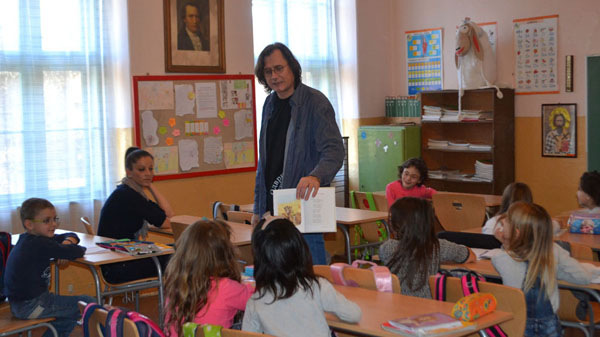 Јухууу! Стигао је мој кум Бранко. Још се није ни распаковао, а одмах је пожелео да се дружи са књажевачким малишанима. Тако смо кренули на пут. Најпре смо обишли децу у школи у Подвису, а затим и у Васиљу. Какво је то дружење било! Бранко им је говорио песме и приче из својих и књига Игора Коларова... „Ето тако“, па „Џепне приче“, „Лепо ти кажем“, „Овако је то било“, „Зоолошка песмарица“, „Авантуре Краљевића Марка“... Дивота!